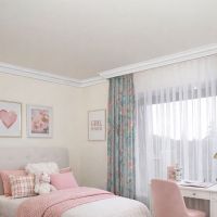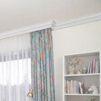 Vor der Gardinenleiste kann nur eine Klebefläche (an der Decke) genutzt werden, deswegen haben wir unsere Vorhangleisten entwickelt. Die obere Klebefläche der Vorhangleiste haben wir vergrößert, die sich dann zum Einbau vor den Gardinenschienen eignet. Zu den Vorhangleisten fertigen wir innere und äußere Eckelemente, die Sie als Weiterführung der Deckenleisten einbauen können, wie auf den Bildern gezeigt ist. Die Größe und das Stuckmuster der Eckleiste und der gleichnamigen Vorhangleiste sowie der Ergänzungselemente sind identisch, auf diese Weise kann eine einheitliche und ästhetische Stuckverzierung gestaltet werden.