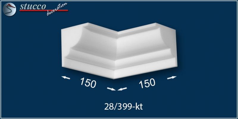 Vorgefertigtes 90°-Außeneckelement, welches das Verbergen der Gardinenschiene erleichtert. Mithilfe des äußeren Eckelements kann die Stuckverzierung als Abdeckung vor der Gardinenschiene weitergeführt werden.